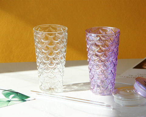 Vaso de vidrio con patrón de escamas de pescado de colores arcoíris de 20oz, vasos de vidrio de borosilicato alto con tapas y pajitas, vasos para bebidas